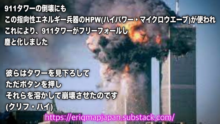 このハイパワーマイクロウェーブは、HPWと呼ばれることもあります。911タワーが倒壊したときもこのHPWが使われ、これにより、911タワーがフリーフォールし、塵と化しました。彼らはタワーを見下ろして、ただボタンを押し、それらを溶かして崩壊させたのです。