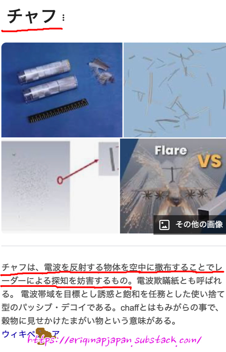 「チャフとは、敵のミグミサイルなどのレーダーに映るように変換されたグリッターである。敵の航空機がこちらにミサイルロックをかけた後、チャフを放出する」…まさに、まったく同じコンセプトですね。