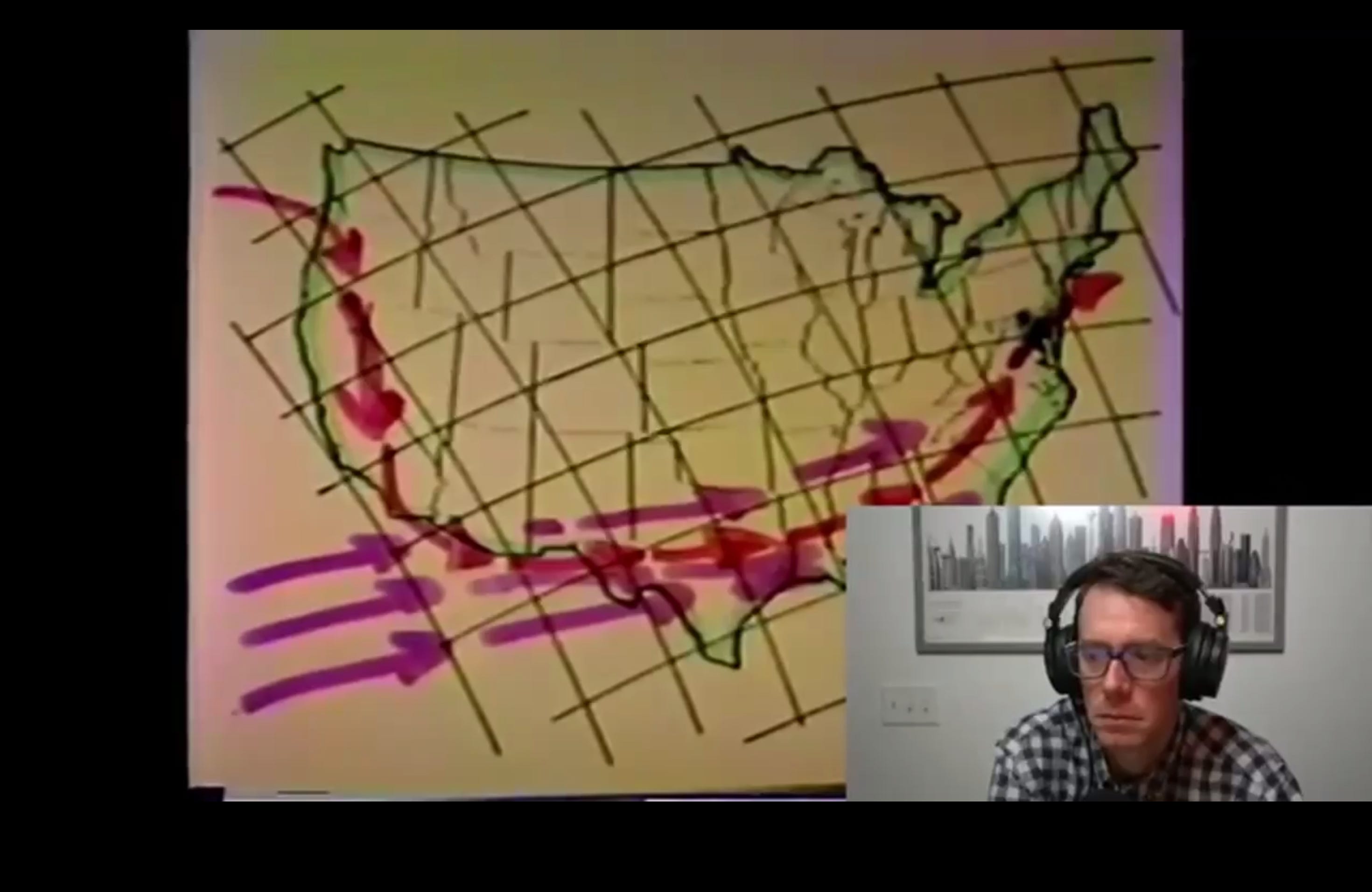 ベアデン:テキサスからこの山脈を駆け上がるというのは見たことがありません。彼らは1984年12月、いろいろな実験をしていました。ジェット氣流を2つに分け、うまく形成させるとどうなるかを、まるで遊んでいるかのように調べていました。この方法では、紫の矢印で示されるように、旋回する時、太平洋から湿氣を引き込み、アメリカ全土を吸い上げ、そして、カナダと北極から十分な寒氣が降りてくるように、ちょっとしたトリックをおこないます。するとその湿氣によって、雪と氷が降るのです。