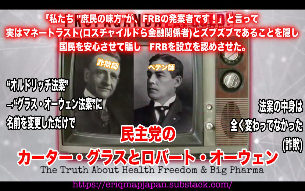 当時は「“マネートラスト” の支配をやめさせよう!」という世論が主流で、国民が金融関係者から権力を奪い、信頼できる政治家の手に委ねる法律を望んでいたため、「FRB法 (連邦準備制度法)の主な目的の一つは “マネートラスト”の支配からの解放である」「選挙で選ばれた政治家を通じて、金融のパワーを国民の手に取り戻そう」といったプロパガンダがおこなわれたのです。