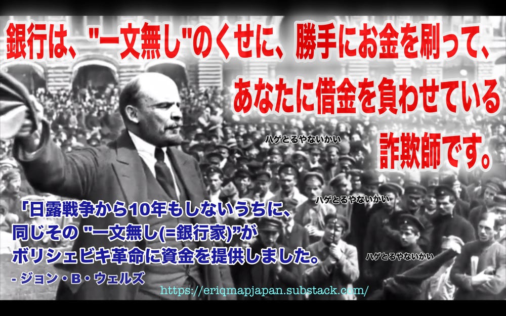 その後10年もしないうちに、同じその “一文無し(=銀行家)”が、ボリシェビキ革命に資金を提供しました。