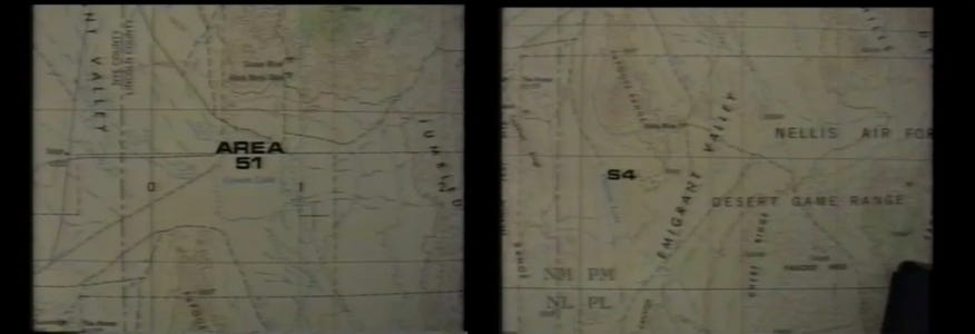 私が仕事に向かう際には、ラスベガスのマッカラン空港からネバダ州の試験場にある厳重に警備された政府基地、エリア51まで飛行機で移動しました。エリア51はラスベガスから北に約125マイル、グルーム山脈とグルーム乾燥湖の近くに位置しています。エリア51からさらに南に約15マイル離れた場所にある、より厳重に警備されたS4と呼ばれる施設までは、バスで移動しました。S4はパプース山脈の麓、パプース乾燥湖の近くにあります。