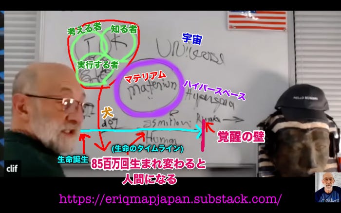 そしてこれは、 “人”という群れをなす動物の大多数が、 “人類の団結”という仕事をこなしている、という理解です。 これをタイムラインで説明すると、生命として始まった存在は、8,500万回の命を経て、人間になるということです。