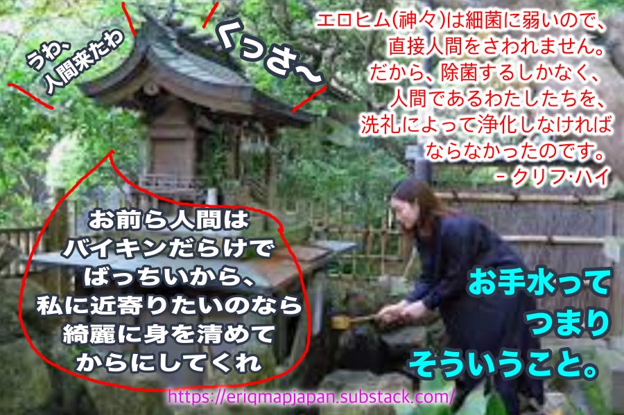エロヒム(神々)は細菌に弱いので、直接人間をさわれません。だから、除菌するしかなく、 人間であるわたしたちを、洗礼によって浄化しなければならなかったのです。