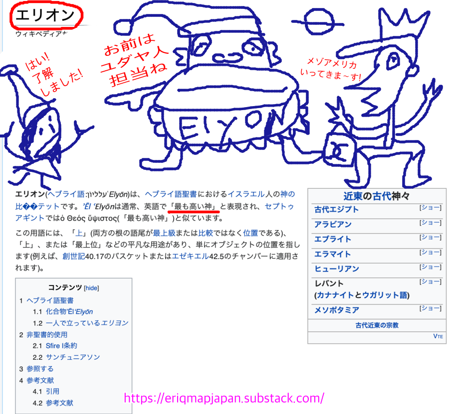 基本的に、何が起こったかというと、宇宙人エロヒムが地球に到着した時、乗組員の指揮官のエリオンという男が、この惑星のすべての民族を分割し、ひとりひとりのエロヒム (=エール)に、地球の広大な地域の住民たちを支配させたのです。ヤハウェはユダヤ人担当、別のエールはメゾアメリカの担当…といった具合に。